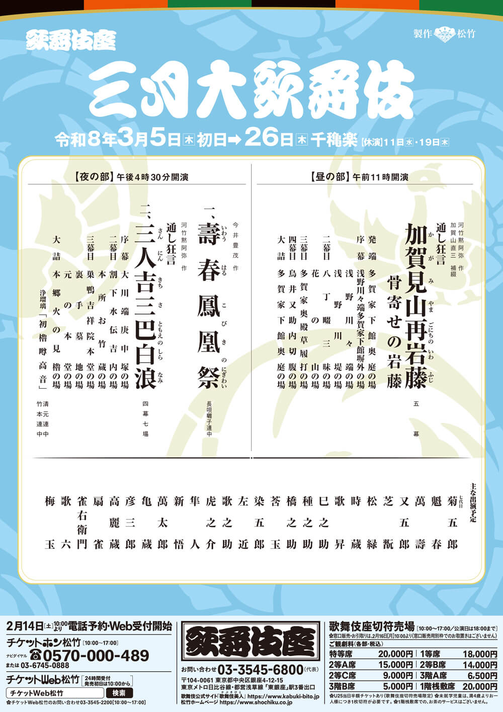 | 演目 | 昼の部(11:00開演) ・通し狂言 加賀見山再岩藤(かがみやまごにちのいわふじ)骨寄せの岩藤 夜の部(16:30開演) ・壽春鳳凰祭(いわうはるこびきのにぎわい) ・通し狂言 三人吉三巴白浪(さんにんきちさともえのしらなみ) |