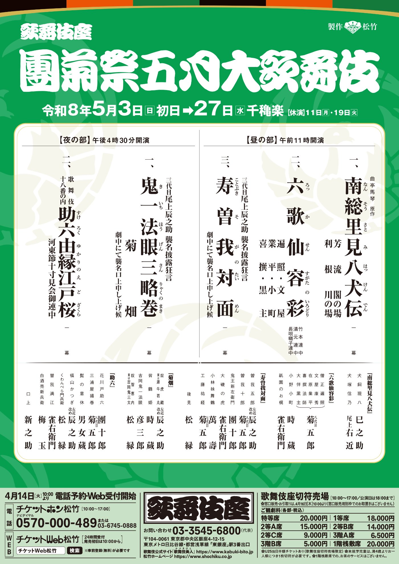 | 演目 | 昼の部(11:00開演) ・南総里見八犬伝(なんそうさとみはっけんでん) ・六歌仙容彩(ろっかせんすがたのいろどり) ・三代目尾上辰之助襲名披露狂言 寿曽我対面(ことぶきそがのたいめん)劇中にて襲名口上申し上げ候 夜の部(16:30開演) ・三代目尾上辰之助襲名披露狂言 鬼一法眼三略巻(きいちほうげんさんりゃくのまき)菊畑 劇中にて襲名口上申し上げ候 ・歌舞伎十八番の内 助六由縁江戸桜(すけろくゆかりのえどざくら) |